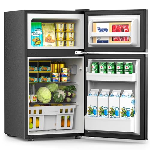 【2 Door Compact Fridge with Freezer】: 3.2 Cu.Ft, 18.9″D × 18.11″W × 33.46″H inches. 0.9 CU FT freezer features ample storage space storage your ice cream or frozen food. 2.3 Cu.Ft spacious cold storage space to store your eggs, vegetables, drinks, fruits, or milk fresh longer.