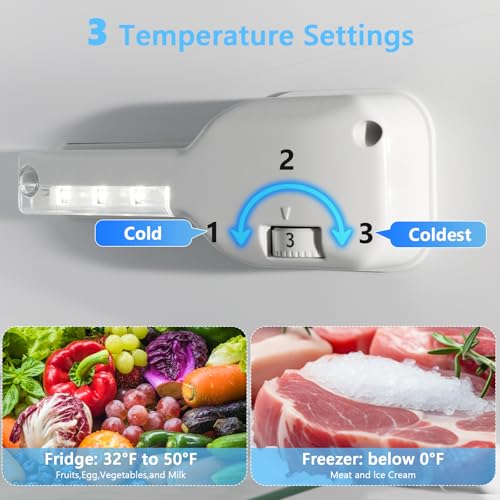 【3 Temperature Settings】The dorm refrigerator with freezer features a 3-level adjustable thermostat knob. The refrigerator compartment temperature ranges from 32°F to 50°F, the freezer refrigerator temperature is with temperatures typically below 0°F, meeting various temperature requirements. It also has a built-in crisper drawer, which is perfect for storing cosmetics