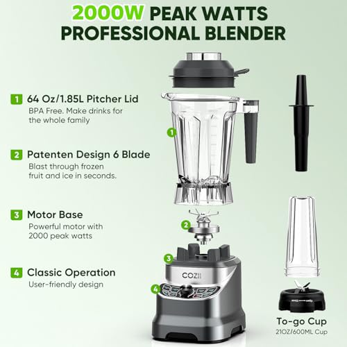 Specification: COZII Professional Blender 2000W, Smoothie Countertop Blenders for Kitchen, 64 Oz Pitcher/21-Oz To-go Cup, 7 Preset Programs for Ice Crush/Frozen Drinks/Dips/Nut Butter, High Speed, Dishwasher Safe