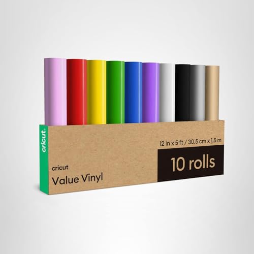 Customize with confidence! With Cricut® Value Vinyl, you can DIY personalized decals, labels, and so much more. This sampler includes 10, 5 ft rolls with a range of colors to help bring your most vibrant ideas to life. Cricut Value Vinyl is dishwasher friendly* and has a plastic PET backer for a frustration-free mat experience. Cricut Value Vinyl is engineered to give you the perfect blend of cost and quality. By selling in bulk sizes and with simple packaging, we pass the savings on to you. Optimized for Cricut cutting machines. Automatic cut settings in Design Space® ensure you have the best cutting experience with every Cricut material and machine.