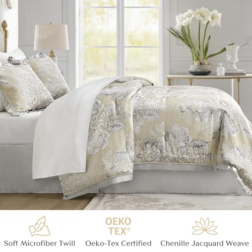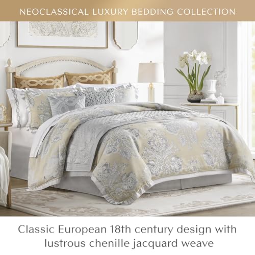 CROSCILL King Comforter Set, Luxe Chenille Jacquard Floral Medallion, Microfiber Twill Comforter for a King-Size Bed, Oversized Comforter King Bedding, 2 Shams & Bedskirt, Loretta, Beige 4 Piece