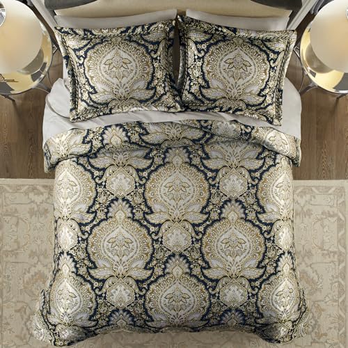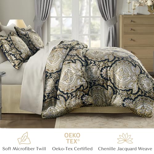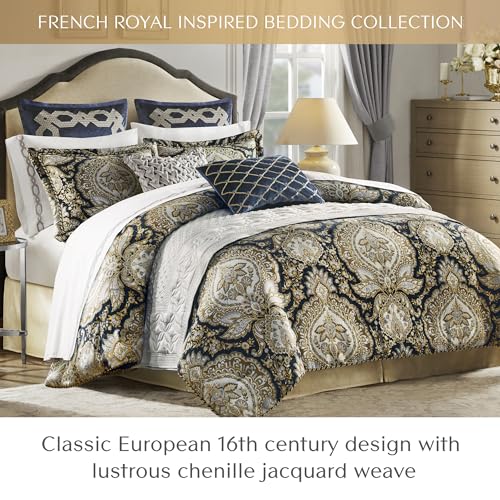 CROSCILL King Comforter Set, Luxe Chenille Jacquard Medallion, Soft Microfiber Twill Comforter & Shams, Bedskirt, Valentina, Navy 4 Piece
