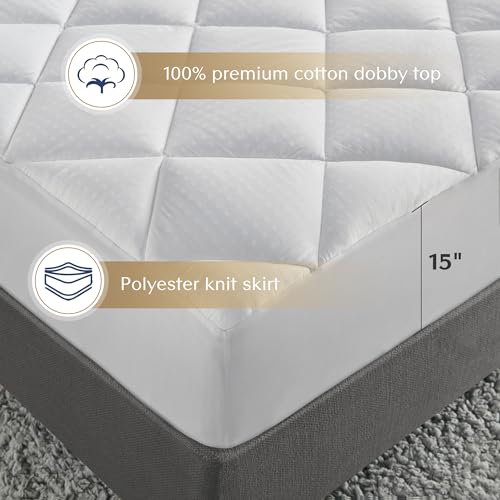 100% premium cotton dobby face mattress pad with waterproof non-woven bottom and polyester knit skirt is fitted for up to 18” mattresses. The ultra-airy and breathable down-alternative fiber delivers a real down-like experience.