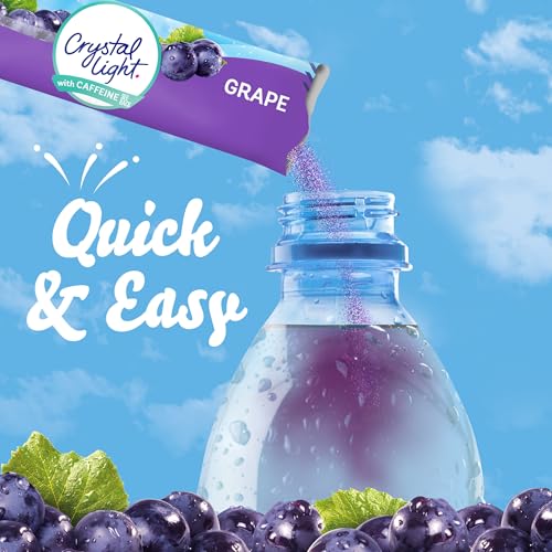 Enjoy great grape flavor with a touch of caffeine anytime, anywhere. Crystal Light Grape Naturally Flavored Powdered Drink Mix with Caffeine is deliciously fruity and can always be taken with you. Containing zero grams of sugar and 10 calories per packet, grape Crystal Light is a sweet alternative to juice and soda. Each powdered drink mix single has 90 percent fewer calories than leading beverages (per 16 fl. oz. our product 10 calories, leading beverages 130 calories), so you don’t have to choose between taste and calories. Each grape drink mix packet also has 60 milligrams of caffeine so you can be at your best all day long. Every box contains 10 sticks of powdered fruit drink mix perfectly portioned to flavor a bottle of water so you can enjoy grape flavor on the go. Simply empty one drink mix packet into a 16.9 fluid ounce bottle or glass of water, mix and enjoy! If you like our on-the-go sticks, try our Crystal Light drink mix pitcher pack.