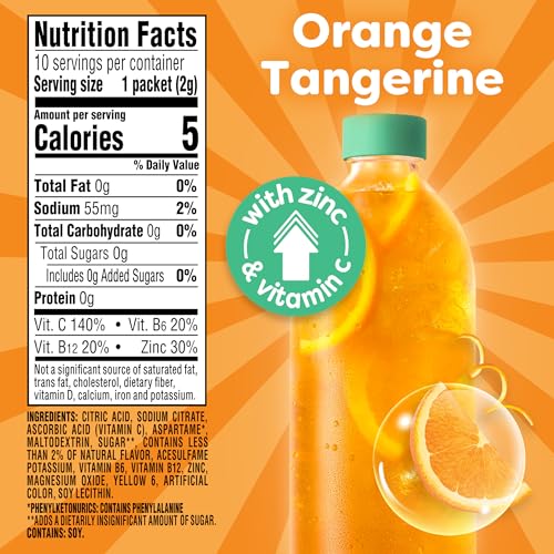 Rise and shine with a refreshing beverage infused with zinc and vitamin C to help support your immune system. Crystal Light Immunity Support Orange Tangerine Powdered Drink Mix contains 30% daily value of zinc and 140% daily value of vitamin C. Our powdered drink mix packets are caffeine free, zero sugar, low calorie and low sodium. Each .07-ounce low-calorie drink mix packet contains 90% fewer calories than leading beverages (per 16 fl oz beverage, this product is 5 calories; leading beverages are 130 calories). To prepare, pour one orange tangerine packet into a water bottle or tall glass of water, shake or stir until dissolved, and enjoy. Enjoy a boost of zinc and vitamin C at home or work, or bring our single-serving packets on the go for a refreshing citrus beverage wherever the day takes you. Crystal Light lets you enjoy fruity refreshment from morning to night. Start your day with our Immunity Support, recharge with Energy Boost and relax with Mixology.