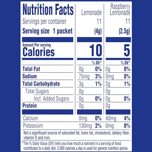 Each variety pack includes 11 lemonade, 11 cherry pomegranate, 11 raspberry lemonade and 11 wild strawberry with caffeine drink mixes