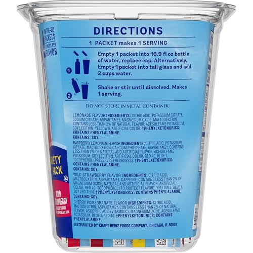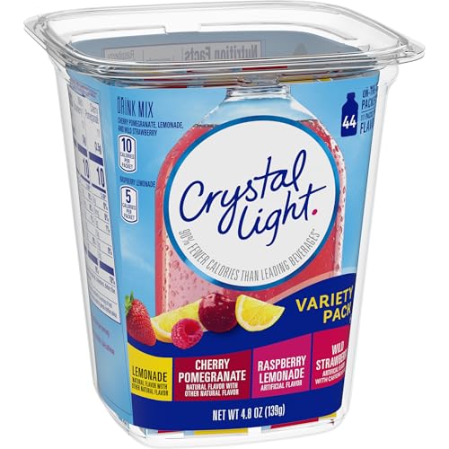 Crystal Light Variety Pack On-The-Go Powdered Drink Mixes are deliciously fruity beverages you can enjoy anywhere. With zero grams of sugar and 10 calories per packet, Crystal Light has 90% fewer calories than leading beverages (this product 10 calories, leading beverages 70 calories), so you don’t have to choose between taste and calories. Each variety pack includes 11 lemonade, 11 cherry pomegranate, 11 raspberry lemonade and 11 wild strawberry with caffeine drink mixes. Our individual packets of powdered drink mix fit easily in your bag, desk, or car, so you can enjoy a refreshing glass of Crystal Light anywhere. Simply empty one packet from our 44-count box into a bottle of water or a glass with 2 cups of water, shake or stir, and enjoy!