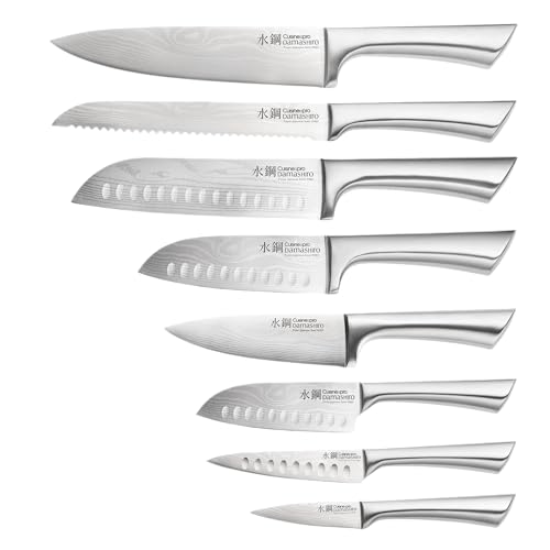 About Damashiro: Engineered with precision and ease in mind, Damashiro Japanese Steel knives are the ideal, all-around set for any kitchen. With ice-hardened, high-quality steel and a tapered blade to allow for a thinner, more precise cutting edge, this knife is built to withstand everyday slicing, dicing and mincing. It also has recessed edges which release thin slices and sticky food with ease, making for a comfortable and quick cutting experience.