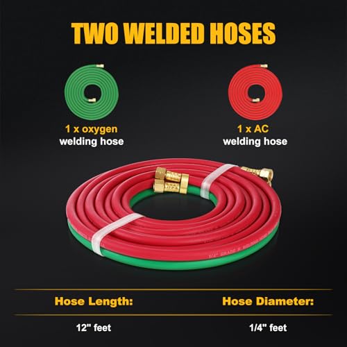 FULL SERVICE: Kit includes 3 welding nozzles and 1 cutting nozzle with your choice of cutting nozzles. Specifications: Nozzle: #0, Hose Length: 12 feet, Hose Diameter: 1/4″, Cutting Capacity: 3/4″, Welding Capacity: 1/2″, Acetylene Pressure Range: 4-12 PSI, Oxygen Range: 8-18 PSI.