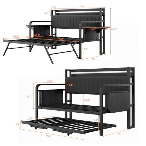 Specification: Daybed with Trundle and LED Light, Heavy Duty Metal Twin Bed Frame with Upholstered Storage Headboard & Charging Station, Day Bed Pop Up Trundle Bed Twin for Living Room,Bedroom and Guest Room (Black)
