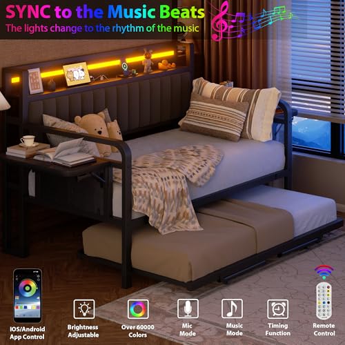 Daybed with Trundle and LED Light, Heavy Duty Metal Twin Bed Frame with Upholstered Storage Headboard & Charging Station, Day Bed Pop Up Trundle Bed Twin for Living Room,Bedroom and Guest Room (Black)