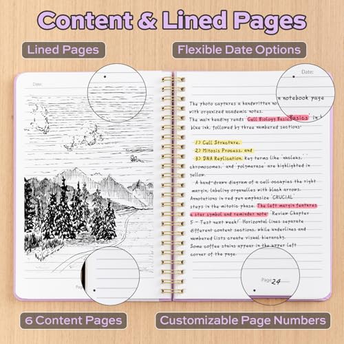 Expandable Inner Pocket & Elastic Band: Lined Spiral Journal Notebook is equipped with an expandable inner pocket on the back cover for storing sticky notes and note cards, making it easy to organize study materials and record inspiration anytime. Featuring an elastic closure band, it closes easily and quickly to prevent damage to the inner pages, offering a more convenient user experience and long-lasting protection.
