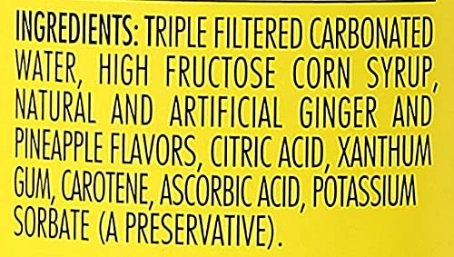 Ingredients: Triple Filtered Carbonated Water, High Fructose Corn Syrup, Natural and Artificial Ginger and Pineapple Flavors, Citric Acid, Xanthum Gum, Carotene, Ascorbic Acid, Potassium Sorbate (A Preservative)