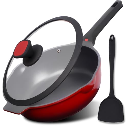 Specification: DIIG Nonstick Deep Frying Pan Skillet with Lid, 12 inch/ 5.5 QT Saute Pan with Silicone Spatula, Sauce Cookware Cooking Chef Pans, Cast Aluminum Induction Compatible, Ruby Red