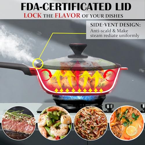 【BRING MORE HEALTH】- To provide healthy and tasty meal, the nonstick coating of this 12 inch deep frying pan is made to be without PFOA, PFOS and APEO. No matter you prefer to fry, stir-fry, deep fry, braise, sauté or make soup, the skillet with lid is always able to provide dishes with less oil and smoke.