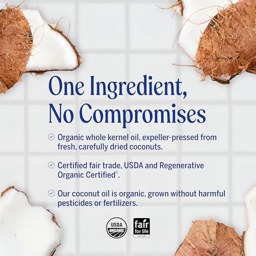 USDA ORGANIC & FAIR TRADE INGREDIENTS ONLY: Dr. Bronner’s Regenerative Organic Certified Virgin Coconut Oil is expeller-pressed from fresh, carefully dried coconut kernels. Contains only 1 ingredient—simple & delicious!