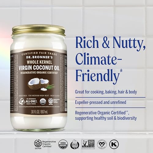 Dr. Bronner’s – Organic Virgin Coconut Oil (Whole Kernel, 30 Ounce) – Coconut Oil for Cooking, Baking, Hair and Body, Unrefined and Fresh-Pressed, Rich and Nutty Flavor, Fair Trade, Vegan, Non-GMO
