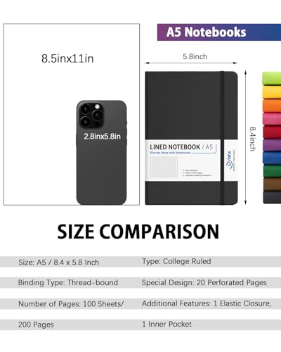 Specification: Dynta Hardcover Journal Notebooks, 10 Packs A5 Lined Journals Bulk for Writing 200 Pages/100Sheets, 8.4 x 5.8 inch, 10 Colors Classic Ruled Notebook for Work/Travel/College/Note Taking
