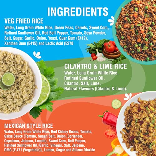 3 Bold Flavors in One Pack – Includes Cilantro & Lime Rice, Mexican Style Rice with Beans and Peppers, and Indo-style Veg Fried Rice. Each flavor is unique, fully cooked, and ready to elevate burrito bowls, wraps, curries, stir-fries, or eat on its own for a flavorful meal solution.