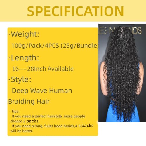 Braiding Hair Length and Weight: The length of human braiding hair is 16 to 28 inch available. The weight is 100 grams per pack, one pack has 4 deep wave bundle braids. We recommend you buy 2 or 3 packs of bulk human hair for braiding
