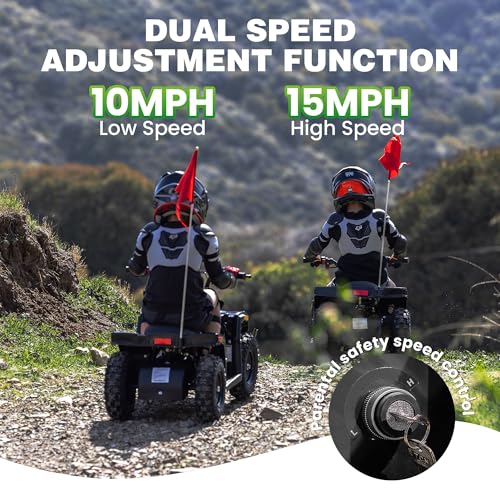 Safe and Controllable: The electric atv provides dual speed modes of 10MPH and 15MPH, meeting the needs of beginners and advanced learners. Parents can flexibly adjust the speed limit through the key. At the same time, it is equipped with a high-performance disc brake system, which responds sensitively and brakes smoothly, ensuring the safety and worry free riding of kids.
