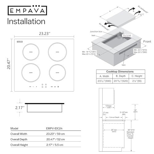 The flawless Empava smooth vitro ceramic glass surface allows for effortless cleanup, manufactured without the release of hazardous metals into the ground and withstands intense heat without cracking or chipping. Compatible to install above any Empava 24/30 in. under-counter single wall oven. Most stainless steel and cast-iron cookware are induction compatible.