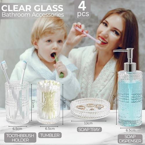 Escenzy Clear Glass Bathroom Accessories Set 4 Pcs | Premium Liquid Soap Dispenser and Toothbrush Holder Set, Qtip Holder, Soap Tray | Bathroom Countertop Organizer | Modern Bathroom Accessory Sets