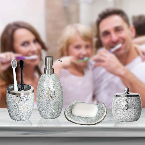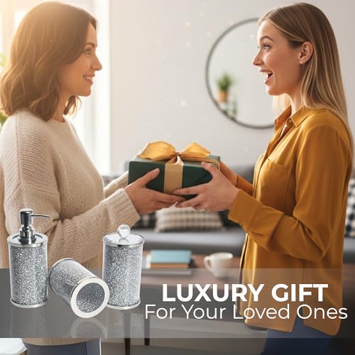 Specification: Escenzy Crushed Diamond & Silver Glass Bathroom Accessories Set 7 Pcs | 2 x Soap Dispenser, 2 x Toothbrush Holder Set 2 x Qtip Holder, 1 x Soap Tray | Modern Bathroom Accessory Set and Vanity Organiz