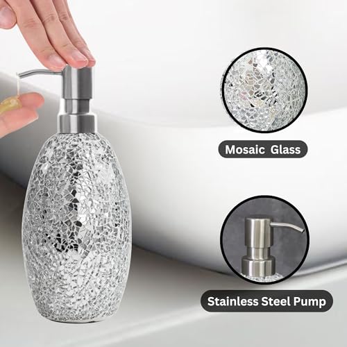 Escenzy Crushed Diamond & Silver Glass Bathroom Accessories Set 7 Pcs | 2 x Soap Dispenser, 2 x Toothbrush Holder Set 2 x Qtip Holder, 1 x Soap Tray | Modern Bathroom Accessory Set and Vanity Organiz