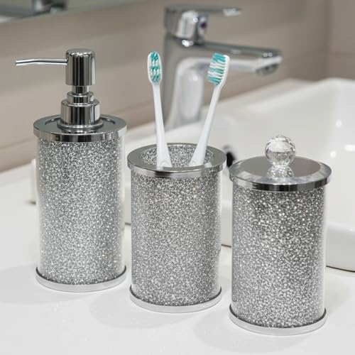 Bring elegance and sparkle to your space with this crystal glass crushed diamond bathroom accessories set in a stunning silver finish. This luxury bathroom accessory set is designed to add a touch of glamour to your vanity, countertop, or sink area. The reflective crushed diamond detailing creates a dazzling effect, making it the perfect modern bathroom decor set or elegant bathroom accessories for guest bathrooms, master baths, or powder rooms. Crafted from premium glass, this glass bathroom accessories set is not only beautiful but also durable and easy to clean. The bathroom soap dispenser and toothbrush holder set keeps your sink organized while enhancing your décor, making it a functional and decorative bathroom vanity set. Whether you need a bathroom counter accessories set for daily essentials, a bathroom sink set for a cohesive look, or a complete bathroom accessories set for a remodel, this silver crystal set delivers both style and practicality. Ideal for gifting, it’s a perfect modern bathroom accessory set for weddings, housewarmings, or holidays. Transform your space with this crystal bathroom accessories set, and enjoy a sparkling, coordinated look that elevates your bathroom’s style.