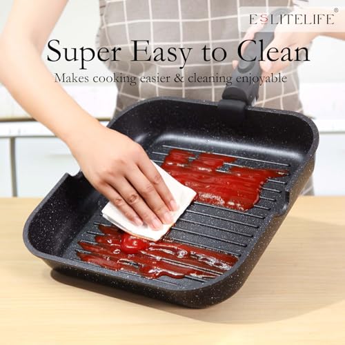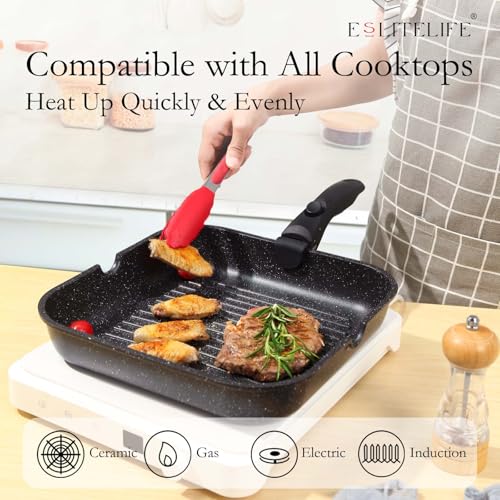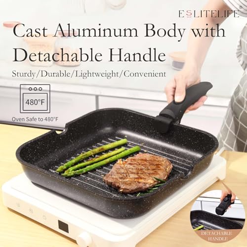 ESLITE LIFE Nonstick Grill Pan with Detachable Handle, Versatile Square Skillet for Indoor Cooking & Outdoor Grilling, PFOA Free, Black-11 Inch