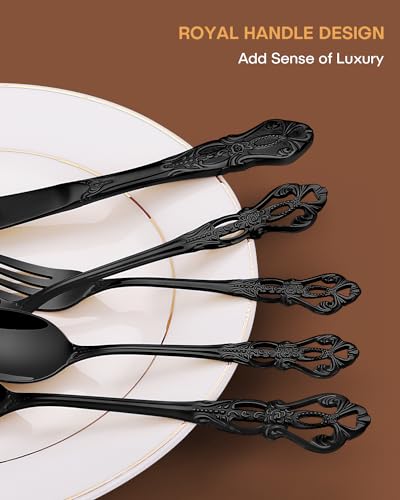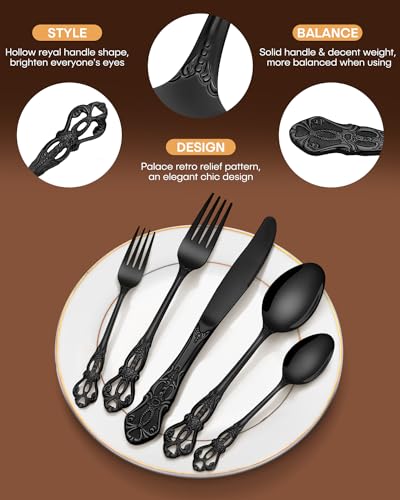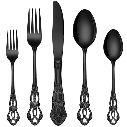 Specification: EUIRIO 30 Pieces Royal Silverware Set for 6, Retro Gorgeous Black Flatware Set, Premium Stainless Steel Vintage Cutlery Set with Forks Spoons and Knives, Dishwasher Safe