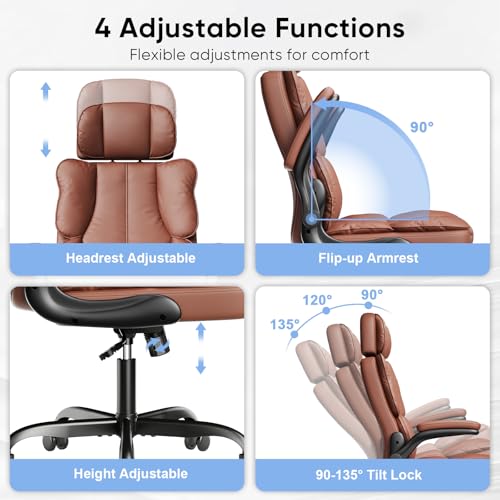 Executive Leather Office Chair, Computer Chair with Thick Cushion & Lumbar Support, Ergonomic Desk Chair with Adjustable Headrest & Armrests,Brown