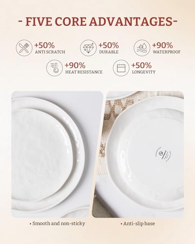 【Premium Material & Durability】Crafted from premium white porcelain, this lead-free, cadmium-free, and BPA-free dishes set ensures safe with durability. The high-fired porcelain’s weight and thickness resist chipping, scratching, and daily wear, keep the ceramic dinner plates always glossy and durable.
