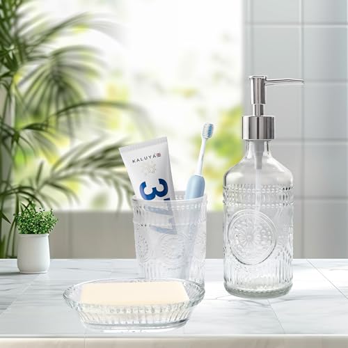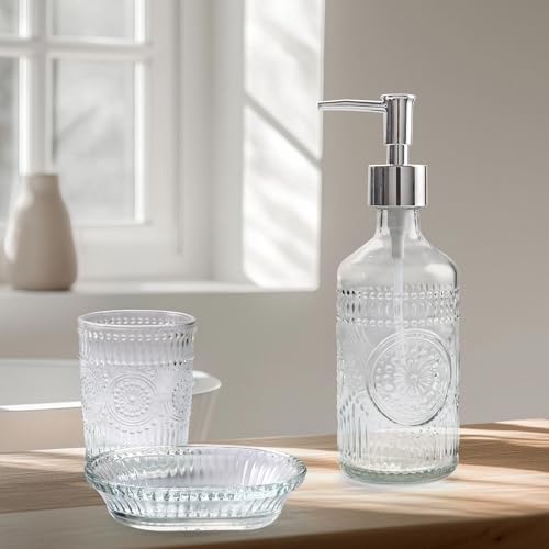 Specification: FEILANDUO 3Pcs Glass Bathroom Accessories Set, Lotion & Soap Dispenser, Toothbrush Holder, Soap Dish, Modern Bathroom Countertop Decor for Home, Housewarming Gift (Clear, 3 Pcs Bathroom Set)