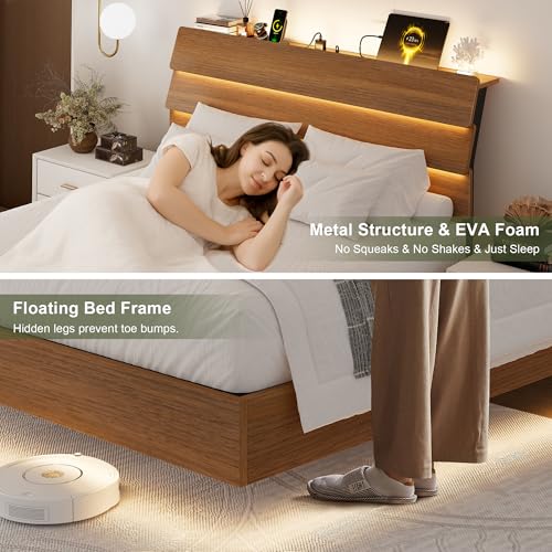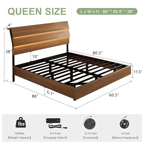 Feonase Floating Bed Frame Queen with Led Lights and Charging Station, Wood Full Size Bed Frame with Storage Headboard, Heavy Duty Metal Slats, No Box Spring Needed, Easy Assembly,Walnut