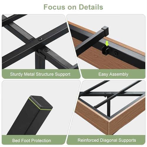 Stable and Noise-Free: 13 heavy-duty metal slats, and legs with reinforced diagonal support, ensure the comfort and durability of the queen bed. The silent bar design reduces friction with the mattress, bringing a good night’s sleep with you