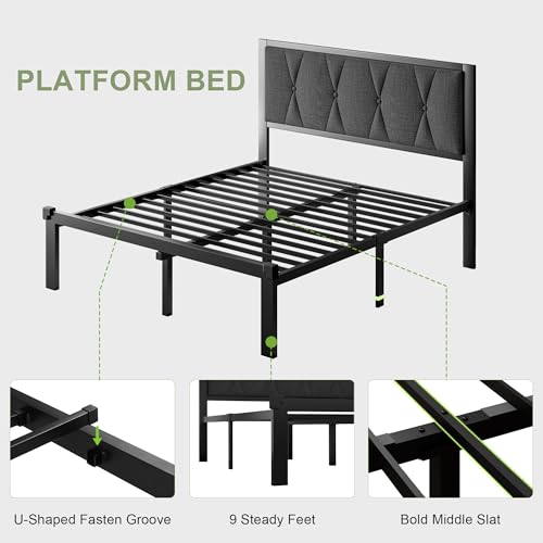 Feonase Queen Metal Bed Frame with Fabric Button Tufted Headboard, Platform Bed with Heavy Duty Metal Slats, 12 Inch Storage Space, Noise Free, No Box Spring Needed, Dark Grey