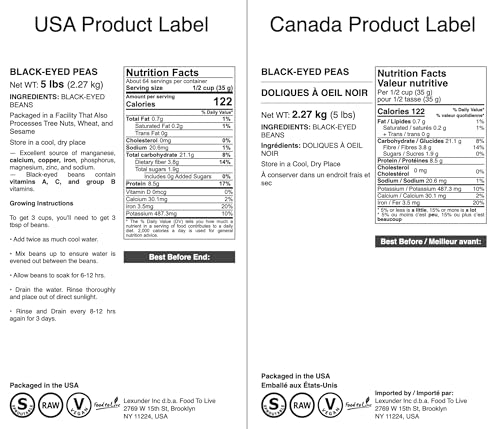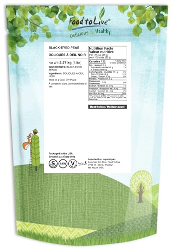 Specification: Food to Live Black-Eyed Peas, 5 Pounds – Raw Dried Whole Cow Peas, Vegan, Sproutable. High in Dietary Fiber, Easy to Cook. Product of the USA
