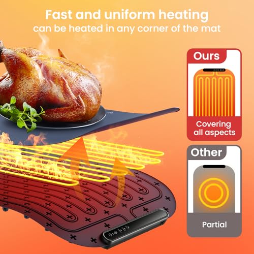 Ultra-Thin Design for Fast, Full-Surface Heating: The warming trays for buffets party At just 1 inch thick, this silicone heating pad saves valuable kitchen space—easily store it in drawers or on shelves. Its upgraded high-performance heating wires ensure even heat distribution across the entire surface, allowing you to place tableware freely. Whether it’s daily family dinners, breakfasts, Christmas parties, outdoor picnics, Thanksgiving feasts,chafing dishes for buffet or backyard chats with guests.