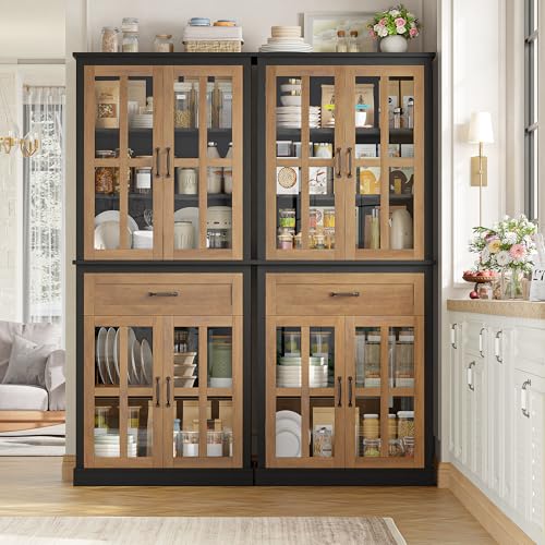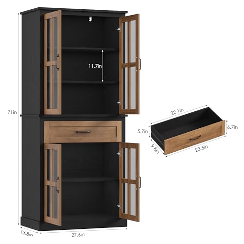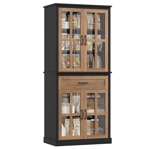 Specification: FOTOSOK 71” Tall Kitchen Cabinet with Glass Doors and Drawer, Freestanding Food Pantry with Adjustable Shelves for Dining, Living Room, Natural