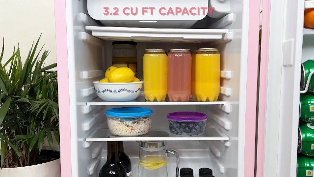 The Frigidaire 3. 2 cu. ft. retro design refrigerator with built-in side bottle opener has enough room to store your favorite foods and drinks, while not taking up a lot of space. The convenient door basket on the reversible door is large enough for 2 l bottles and canned drinks. This low energy consumption refrigerator is perfect for the office or extra rooms away from the kitchen with its space saving flush back design.
