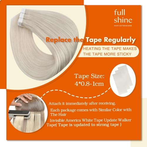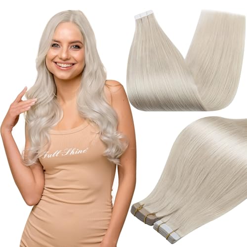Full Shine Human Hair Extensions Tape in 16Inch Invisible Remy Tape in Hair Extensions Double Sided Adhesive Color 1000 Blonde Silky Straight Real Human Hair Tape ins Human Hair 50G 20Pcs for Wedding