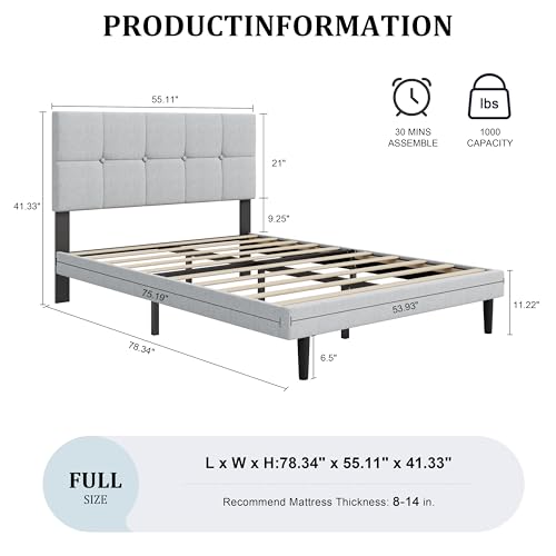Specification: Full Size Bed Frame, Full Size Platform Bed Frame with Headboard, Fabric Upholstered Headboard, Sturdy Wood Slats, No Noiseless, No Springs Required, Easy to Assemble, Gray