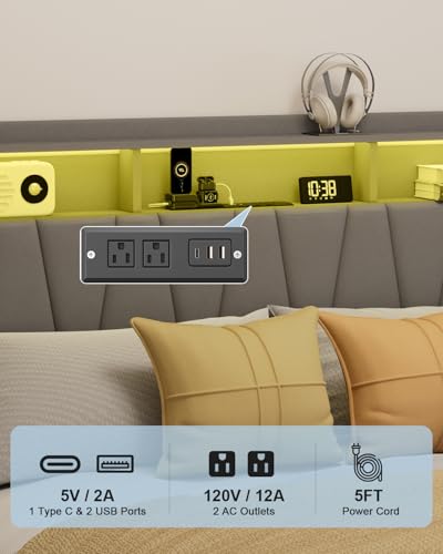 【Full Bed Frame with Headboard】① Full size bed includes a built-in charging station with 2 AC outlets, 2 USB port, 1 Type-C port; ② Full bed frame with headboard shelf for daily essentials such as books, phones, cameras, etc