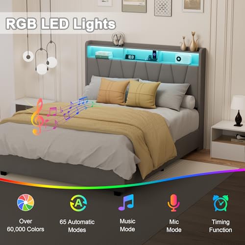 【Modern and Elegant】Full size bed frame with a modern design and plush velvet, featuring a headboard with storage and colorful LED lighting, adding a touch of elegance and style to any bedroom.(The velvet shifts in color depending on the angle and lighting, appearing darker in shadows and lighter in bright light.)