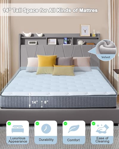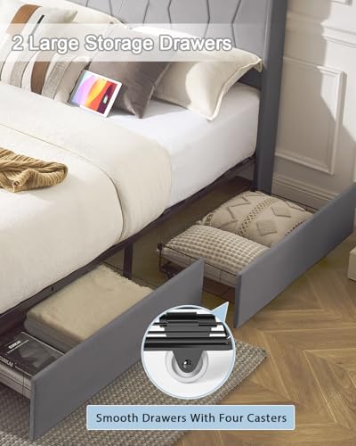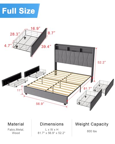 Specification: Full Size Bed Frame, Velvet Upholstered LED Platform Bed with Headboard Storage, Bed Frame Full Built-in Charging Station with 4 Drawers, Wood Slat Support, No Box Spring Needed, Grey