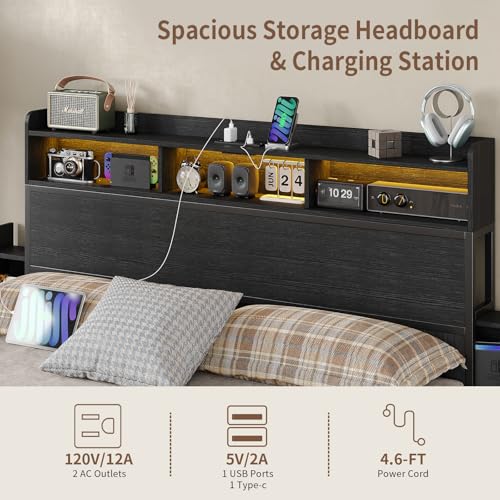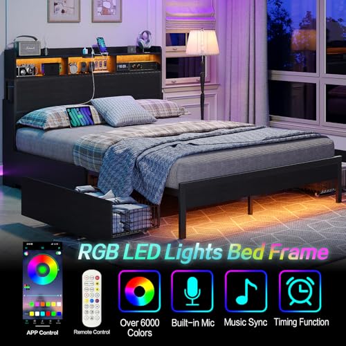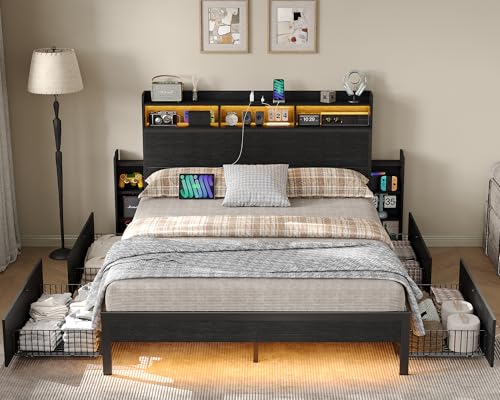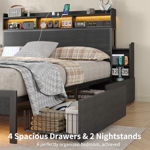 Specification: Full Size Bed Frame with 4 Storage Drawers & 2 Hidden Nightstands, Platform Bed with RGB LED Lights & USB Charging Station, No Box Spring Needed, Noise-Free, Black