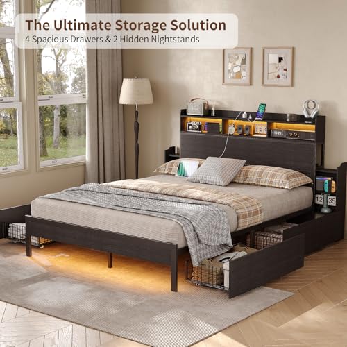 Full Size Bed Frame with 4 Storage Drawers & 2 Hidden Nightstands, Platform Bed with RGB LED Lights & USB Charging Station, No Box Spring Needed, Noise-Free, Black