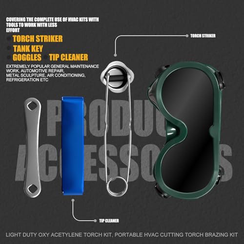 Package:1 X Ligth Duty Brazing Torch Handle, 2 X Welding Tips, 1 X Check Valves, 1 X CGA540 Oxygen Regulator, 1 X Acetylene Regulator, 1 X Oxy Acetylene hose, Goggles、Spark Lighter and Tank Key